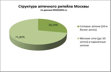 В Москве насчитывается около 20 сетевых аптечных структур с количеством от 10 аптек. Их доля на рынке аптечного ритейла столицы составляет почти треть всей фармацевтической розницы (28,2% аптек).